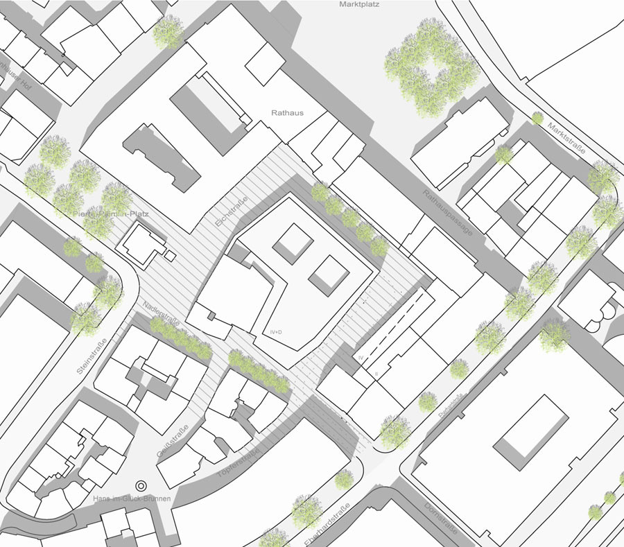 Die künftige Bebauung des Areals wirkt als Bindeglied zwischen Marktplatz, Rathaus und historischem 'Hans im Glück'-Quartier.